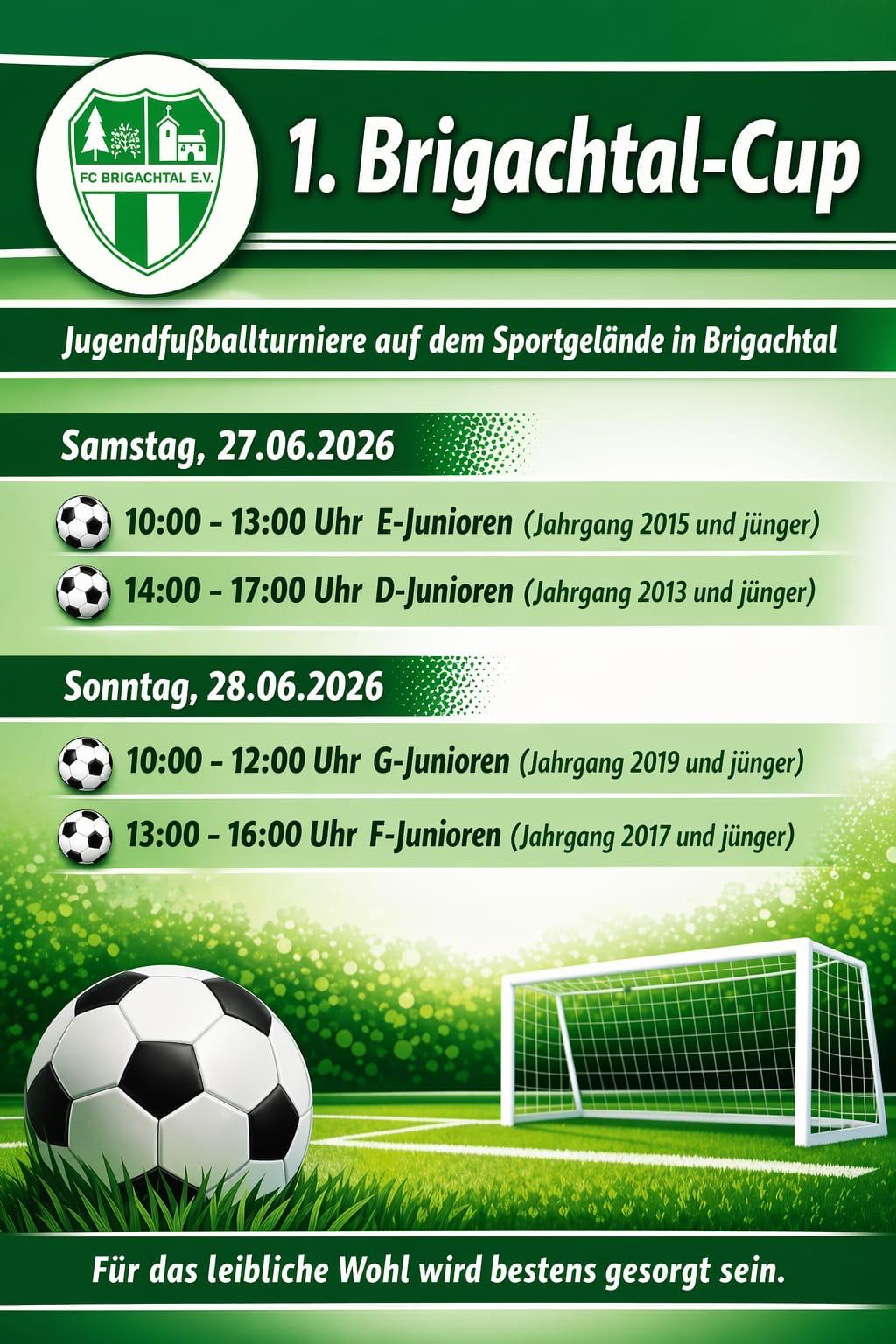 Der FC Brigachtal e.V. veranstaltet vom 27.06.2026 bis zum 28.06.2026 sein Jugendfußballturnier auf dem Sportgelände in Brigachtal und wir laden Euch/Sie herzlich ein.
